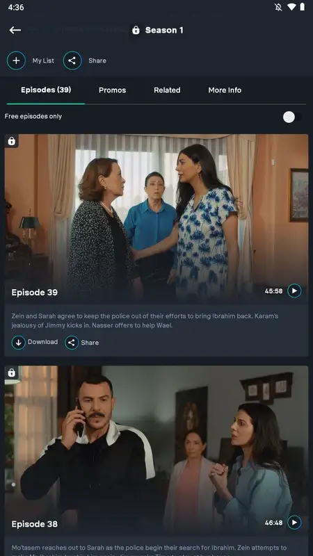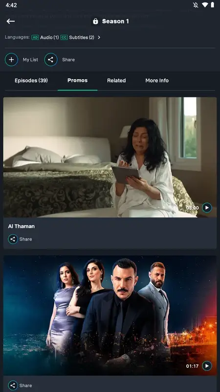 После выбора нужного контента, SHAHID покажет все доступные материалы, связанные с ним. Для сериалов будет представлен список эпизодов, описание каждого, а также возможность скачать серию для просмотра без интернета. Если вы не уверены в выборе, можно просмотреть короткие промо-ролики, которые дают представление о последних сериях.