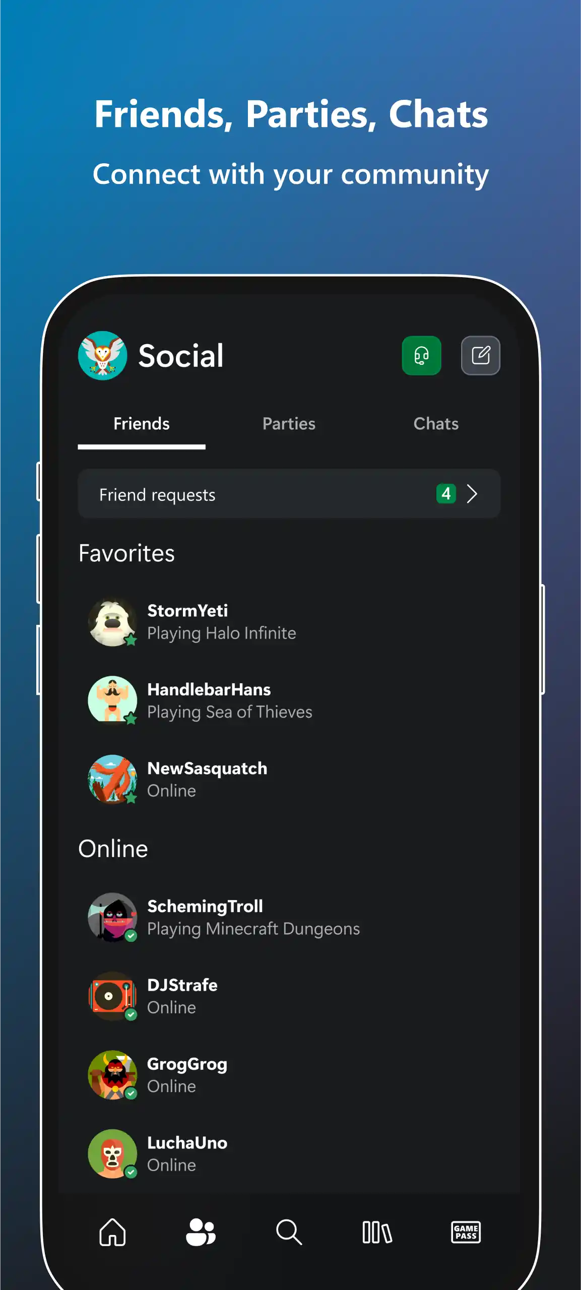 Легко делитесь игровыми видео и скриншотами с консоли в любимых игровых и социальных платформах. Ваши друзья и команды могут следить за вами через голосовой и текстовый чат, даже если они играют на другой консоли или ПК. Просматривайте уведомления, свои достижения и успехи друзей, а также сообщения и многое другое. Играйте в консольные игры прямо на телефоне через интернет. Откройте каталог Game Pass, получайте перки и многое другое. Бесплатное приложение Xbox — идеальный способ оставаться в игре, где бы вы ни находились.