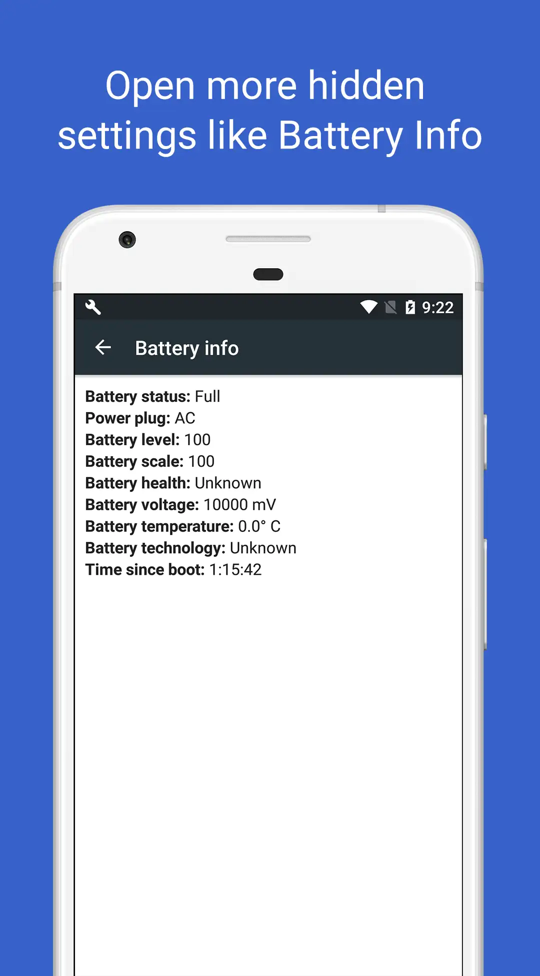 Приложение также предоставляет доступ к другим скрытым настройкам, включая журнал уведомлений, информацию о батарее, статистику использования и сведения о Wi-Fi.