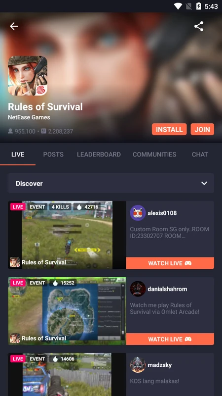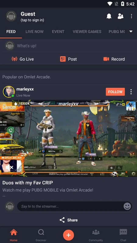 Одно из ключевых преимуществ Omlet Arcade — возможность фильтровать трансляции по конкретным играм. Например, вы можете легко найти стримы PUBG. Если у вас ещё нет этой игры, вы можете загрузить её прямо из приложения одним нажатием.