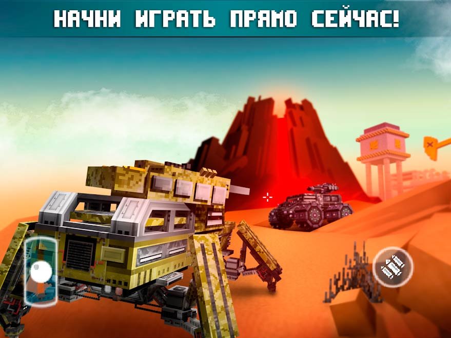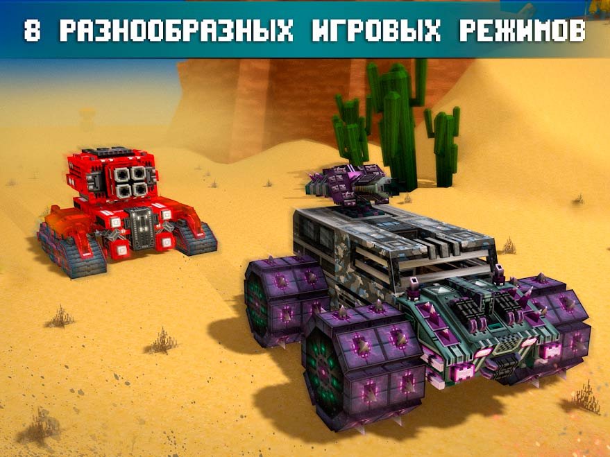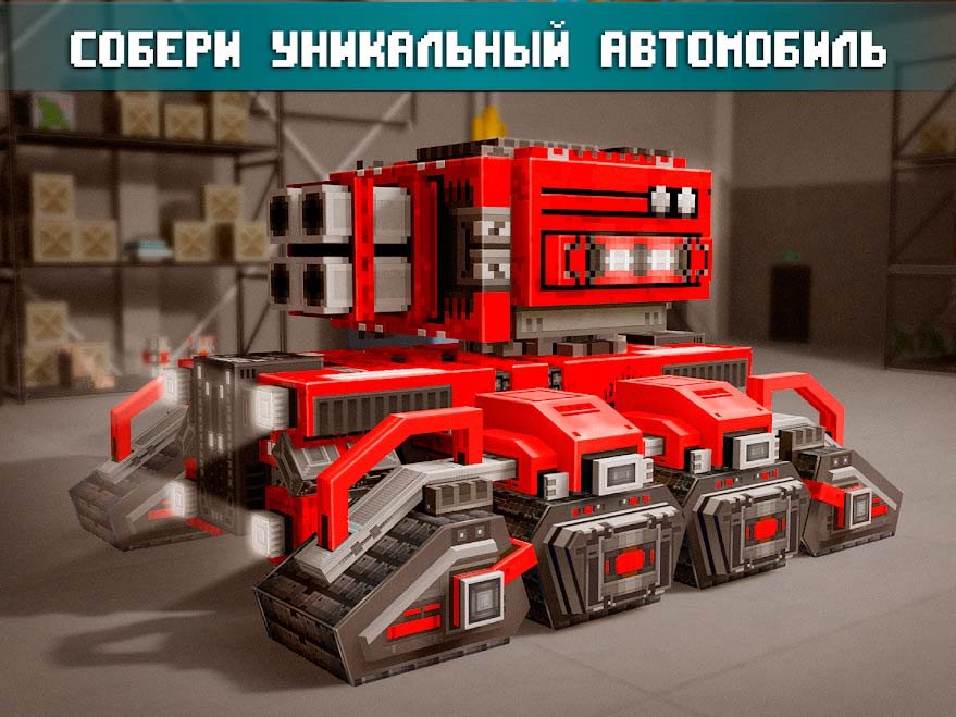 Сразитесь с легендарными игроками вселенной в многопользовательском режиме и собирайте максимально вооруженную технику. Используйте боевой транспорт, чтобы уничтожить своих соперников и даже воспользуйтесь самолетами. Благодаря разнообразным блокам вы сможете создавать нереально мощную технику. Выберите самостоятельно мощные колеса, установите в качестве пушки турель или миниган и начинайте уничтожать массу вооруженной техники соперника. В игре уже сейчас доступно больше 12-ти оригинальных пиксельных локаций, где начнется напряженная и масштабная битва машин.