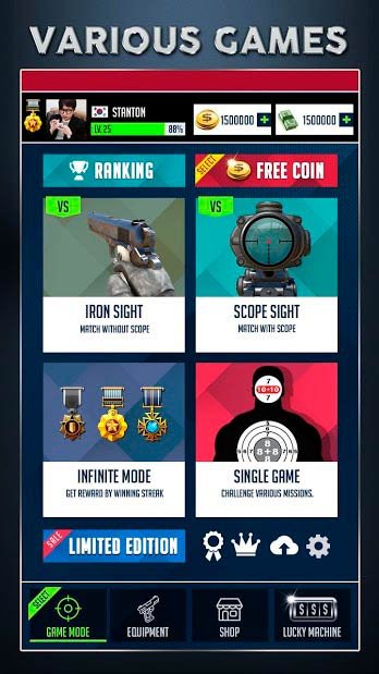Начните прямо сейчас собирать свой собственный арсенал вооружения, чтобы потом его прокачивать и начинать перестрелку. В процессе повышения своих навыков игрок сможет повысить общий уровень мастерства и стать более опытным стрелком. Много разнообразного огнестрельного оружия будет доступно игроку, чтобы продолжать участие в миссиях. Принимайте вызов от своих друзей и наоборот вызывайте их. Захватывайте новые игровые локации и выигрывайте апгрейды. Каждая новая локация выглядит как шикарный фон, и в ней будет приятно участвовать в поединках. Больше сотни уровней игрок сможет пройти, пока не добьется первой позиции в рейтинге.Информация об игре