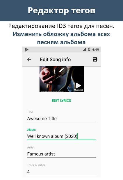 - Редактирование тегов и даже изменение оригинальной обложки музыкальной композиции;