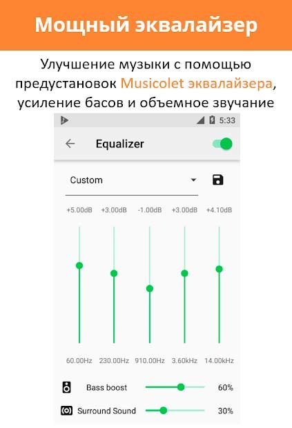 Воспользуйтесь простым интерфейсом и управлением всеми режимами и функциями этого потрясающего аудиоплеера. Здесь вы легко сможете прослушивать музыкальные очереди и создавать их сможете через использование всех категорий. Всего лишь один клик отделяет вас от создания своего первого плейлиста. Управляйте гарнитурой через функционал этого приложения и спокойно просматривайте, что находится в папках на вашем мобильном устройстве. Используя мощный эквалайзер, вы сможете заметно улучшить собственное воспроизведение музыки.