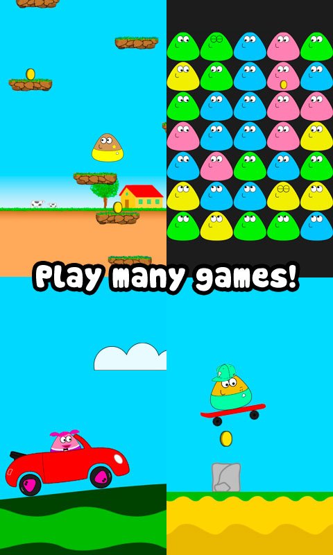 Попробуйте скачать Поу на андроид и поймете, как много всего можете сделать для такого маленького персонажа. Смотрите за тем, как он будет расти, и не забывайте кормить его вовремя. Проводите с ним больше времени за игрой в специальной комнате. Собирайте монетки в мини-играх, чтобы купить ему новый наряд или какую-нибудь крутую игрушку. Он будет счастлив такому подарку. Проводите лабораторные эксперименты над зельями, которые так нравятся Поу. Сделайте его внешний образ оригинальным, чтобы он был доволен так гулять каждый день. Одевайте ему модную шапку, выбирайте стильные очки и много других элементов одежды.