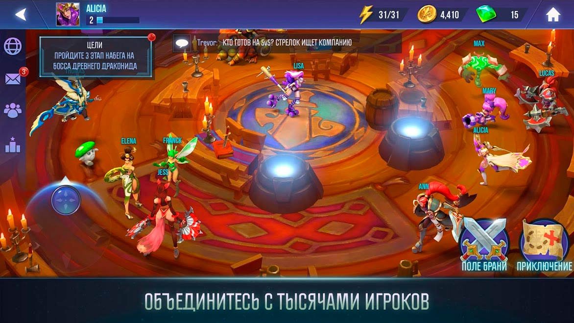 Тысячи игроков по всему миру, которые ежедневно сражаются за звание лучших. Вместе с друзьями вы можете организовать мощную гильдию и вместе собираться в сражениях самых масштабных аренах. Бейтесь с игроками по всему миру в командных битвах пять на пять. Подключайтесь к фантастическим аренам и получите награду за звание лидера мира фантастики. Три сотни героев и чемпионов со своими уникальными особенностями и характеристиками. Наслаждайтесь такой крутой атмосферой и ходите в битвы между легендарными Боссами. Проходите не только многопользовательские сражения, но и сюжетную компанию между монстрами, демонами и Драконами.