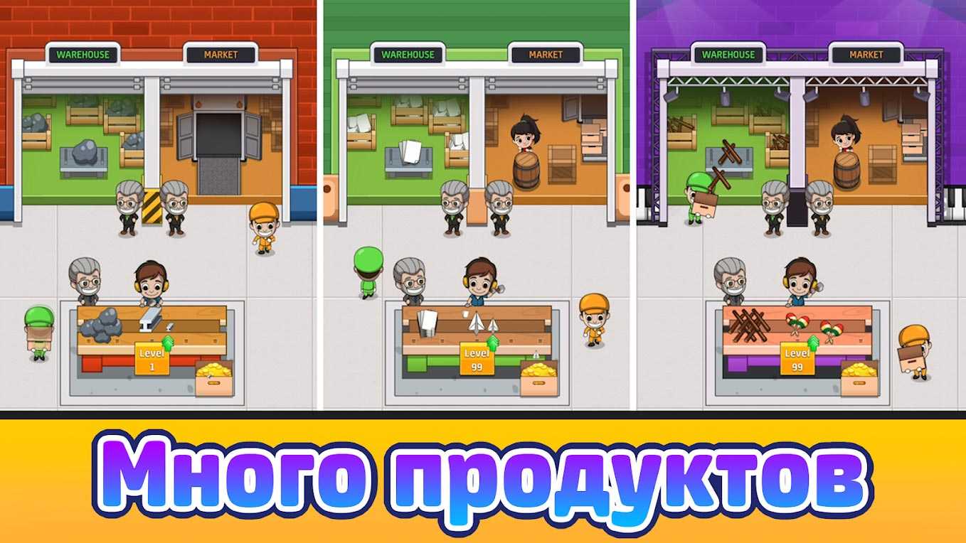Занимайтесь производством огромного масштабного завода и постоянно развивайтесь. Вы можете нанимать огромное количество работников и сотрудников, чтобы таким способом полностью автоматизировать процесс игры. У вас будут работать профессиональные менеджеры, а потом товары будут продаваться в автоматическом режиме. Используйте огромное количество бонусных улучшений, чтобы развивать свой завод в огромных масштабах. Вместе с работниками вы сможете добраться до величайшего уровня магната. Станьте самым лучшим промышленником во всем мире отстраивайте ежедневно новые заводы и устанавливайте новое обмундирование.