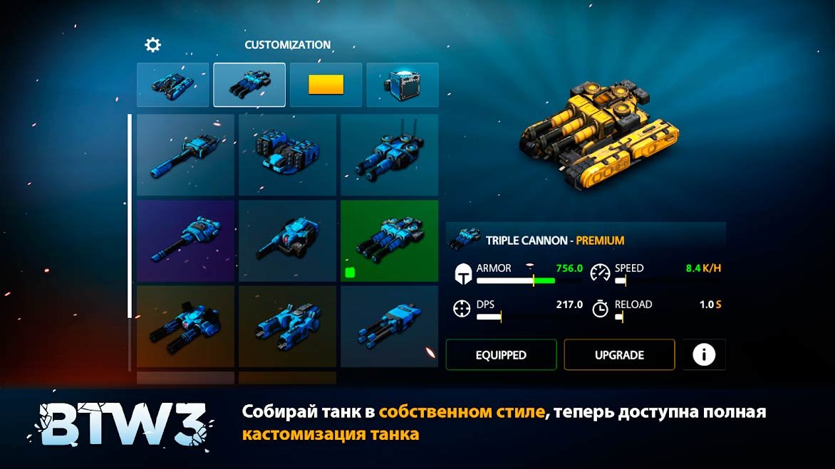 - Огромное количество апгрейдов, чтобы прокачать свой танк и повысить его мощность.