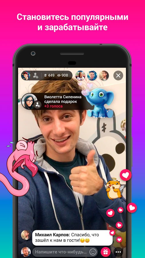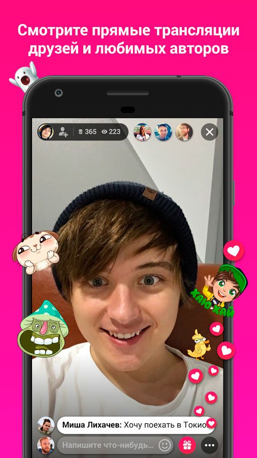 Можно выбрать любой из видов общения. Так пользователь может говорить с подписчиками устно или с помощью комментирования. Делайте идеальные подарки авторам очень интересных трансляций и получайте их от своих просмотров. Заработайте на своих трансляциях голоса, которые можно будет использовать как валюту в социальной сети. Потом за эти голоса можно будет купить еще более оригинальные стикеры, которые непременно понравятся пользователям, для которых будет сделана ваша трансляция. Поделитесь с друзьями самыми яркими событиями в вашей жизни и расскажите им удивительную историю.Информация об игре
