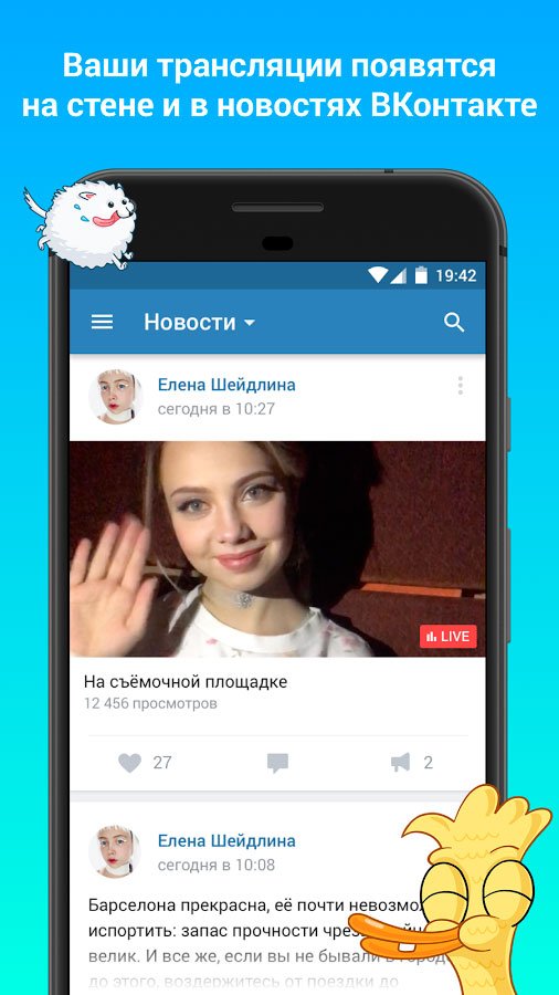 Когда сможете скачать VK Live на андроид, поймете как много преимуществ и достоинств у этого предложения. Делитесь со своими подписчиками самой редкой и необычной информацией. Подарите им радость и поделитесь своими приятными эмоциями. Попробуйте завести больше новых друзей, с которыми можно будет завести беседу по вашей любимой теме. Трансляции можно будет проводить не только со своей личной страницы, но и с сообщества. В любой момент можно подключиться к трансляции ваших друзей или к той, которая близка по теме. При общении можно использовать стикеры и наклейки. Читайте всплывающие комментарии и отвечайте на них.Создавай оригинальные трансляции