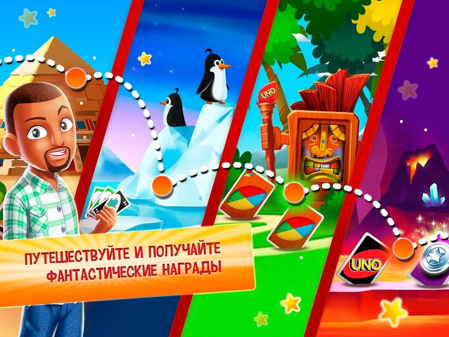 Разработчики построили проект настолько качественно, что научиться играть можно за несколько минут. Остановиться будет крайне тяжело. Принимайте участие в турнирах, становитесь чемпионом и продвигайтесь по карьерной лестнице. Играйте в разнообразных режимах, пользуйтесь специальными бонусами и подготавливайте уникальную стратегию. Чем лучше все продумаете, тем интереснее будет продвигаться дальше. Используйте способности компаньонов, улучшайте уровень, приглашайте друзей в проект и создавайте уникальную команду. Без хороших напарников одержать победу в том или ином турнире будет крайне тяжело. Если готовы приступить, пробуйте скачать UNO & Friends на андроид и бросайте вызов фанатам проекта. Загрузка осуществляется совершенно бесплатно, без каких-либо оплат за открытие карт или других уникальных штучек. Мы все подготовили для вас и готовы обеспечивать вас до финальной стадии проекта.