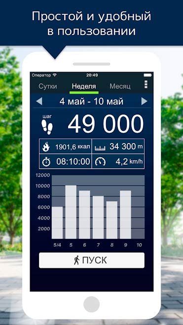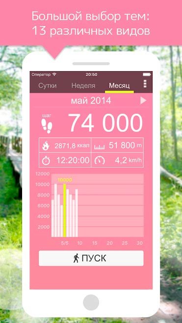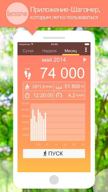 С приложением «Шагомер» вы всегда будете знать о пройденном расстоянии. Для того, чтобы начать отсчет своих шагов, достаточно лишь нажать кнопку «старт». Программа автоматически станет фиксировать количество сделанных вами шагов, даже если телефон находится в кармане или сумке. Количество учтенных шагов всегда можно посмотреть на экране в виде красочной диаграммы. Внешний вид приложения и некоторые темы можно легко изменить с помощью настроек – вы сами выбираете многие аспекты работы программы и используемые ей инструменты.