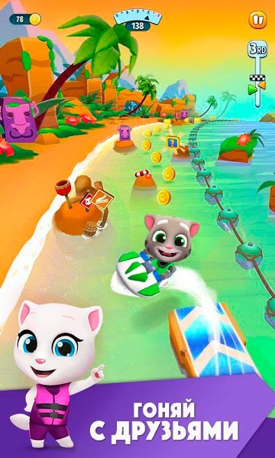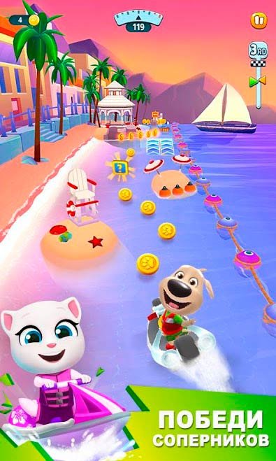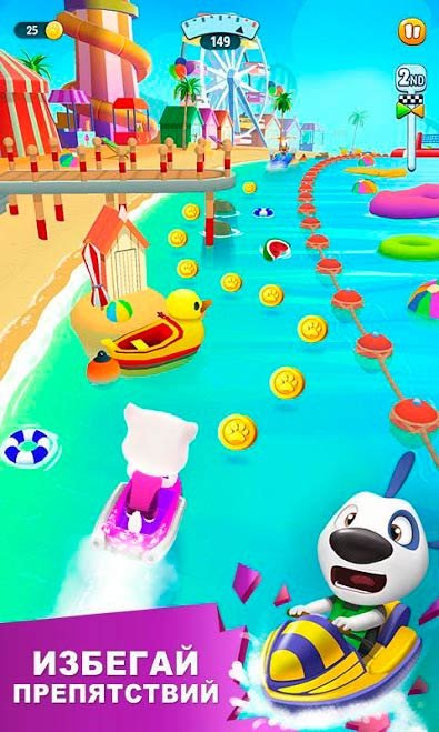 У этой удивительной серии игр про говорящего питомца огромное количество поклонников по всему миру и вы не должны пропускать продолжения прямо сейчас. Наслаждайтесь этой интересной и веселой игрой вместе с друзьями питомца. Когда сможете скачать Аквабайк Говорящего Тома 2 на андроид, получите массу удовольствия и сможете поднять себе настроение. Игра из этой серии будет интересной как для взрослых, так и для детей, ведь здесь можно весело провести время. Гоняйте каждый день на водном байке и собирайте по пути невероятное количество монеток, на которые потом можно будет построить домик на пляже и заняться его обустройством. Красивая графика и уникальный геймплей остались прежнему, но в игре заметно добавилось улучшений.