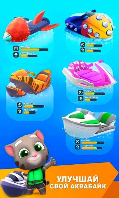 Игрок сможет выбрать любого из друзей говорящего Тома. Среди них есть Анджела, Хэнк, Бен и Джинджер. У каждого есть свой крутой водный байк, на котором можно будет участвовать в напряженных гонках и добиваться победы. Дождитесь момента, когда вся команда соберется вместе и продвигайтесь, собирая золото. Если скачать Аквабайк Говорящего Тома 2 на андроид можно будет наслаждаться выбором из 25-ти удивительных водных байков, и каждый обладает своими характеристиками. Собирайте как можно больше ускорителей, чтобы добиться финиша первым и выиграть достижение. Вас ждет несколько красивых и по-своему волшебных локаций. Наслаждайтесь замечательным продолжением игрового процесса и ставьте новые рекорды.