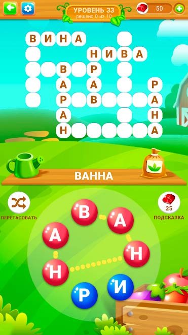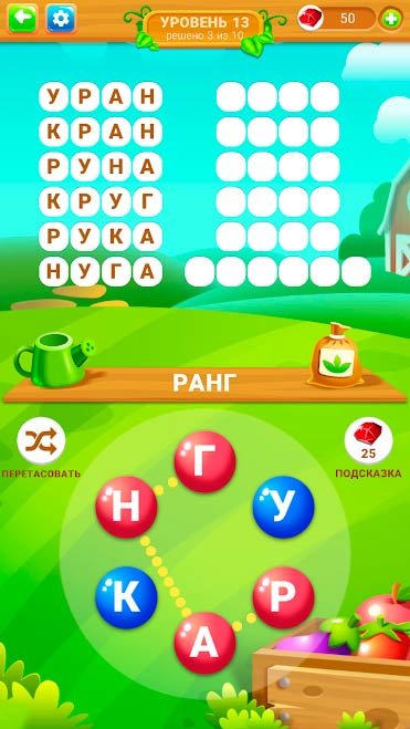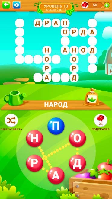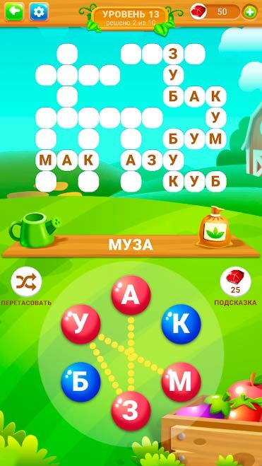 Проект получил множество особенностей, за счет чего оказывается в списке лучших игр, связанных с кроссвордами. Проявите свою логику, покажите способности решения головоломок и еще многое другое. Уникальность приложения заключается в том, что в него можно погрузиться вместе со всей семьей. Повышайте словарный запас, воспользуйтесь довольно-таки простыми правилами, предоставленными разработчиками. Решайте как можно больше головоломок и тренируйте собственный мозг. Напомните мозгу о том, что расслабляться ни в коем случае нельзя. Игра совместима с разнообразными устройствами, независимо от того, насколько слабыми или сильными являются внутренние характеристики мобильного телефона. Готовы погрузиться в прохождение? Тогда нужно скачать Ферма слов (на русском) на андроид и проходить все предоставленные уровни. Скорее всего эта игра подойдет не только для вас, но и для всех ваших друзей. Загружайте ее, знакомьтесь с сюжетом и добивайтесь успеха.Информация об игре
