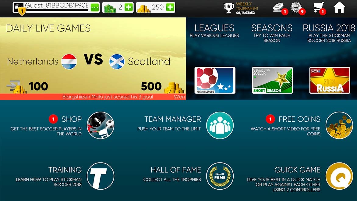 Постарайтесь подобрать любимую команду в игре и продвигайтесь вверх по карьерной лестнице. Играйте в различных сезонах, преодолевайте национальные лиги и проходите все кубки. Таким образом вам удастся добиться серьезных результатов и стать одним из лучших игроков. Старайтесь не получать карточки, ведь из-за них можно вылететь на длительное время и совсем не играть. Нажимайте на разные кнопки, добивайтесь серьезного успеха и настраивайте собственные способности. Любой из футболистов стоит определенную сумму денежных средств. Деньги у вас также ограничены, потому старайтесь не тратить их просто так. Подберите хорошую команду и выберите собственный путь, продвигаясь по нему как можно скорее. Готовы? Тогда стоит скачать Stickman Soccer 2018 на андроид и познакомиться с предоставленными режимами поближе.Информация об игре