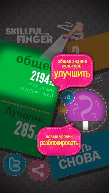 Проект получил множество особенностей, за счет чего стоит обратить на него внимание. Имеется поддержка русского языка, а также встречается невероятно большое количество разнообразных уровней. Становитесь лидером игры, продвигайтесь по таблице и будьте готовы к серьезным проблем. Линия является бесконечной. Среди игр проект оказался идеальным. Ранее ничего подобного не встречалось. На самом деле, на нашем сайте можно найти множество подобных проектов, но мы советуем скачать Умелый палец на андроид прямо сейчас. Чем быстрее вы загрузите ее на устройство, тем быстрее сможете достичь огромных успехов. Мы уверены, что у вас все обязательно должно получится. Играйте вместе с друзьями, проходите уровни и добивайтесь успеха в игре.