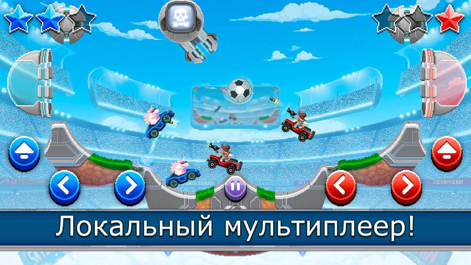 Вы должны скачать Drive Ahead! Sports на андроид, если ищите новых ощущений. Постарайтесь стать настоящим профессионалом в этом виде спорта и порадуйте публику сногсшибательными ударами. Необходимо продемонстрировать все свои возможности, и даже хитрость. Благодаря использованию в игре локального мультиплеера стало возможно в один клик бросить вызов своим родным или друзьям. Теперь вы можете показать им все свои способности к футболу на тачках. Выбирайте друга и бросайте ему вызов, как только он его примет начнется фантастический матч.