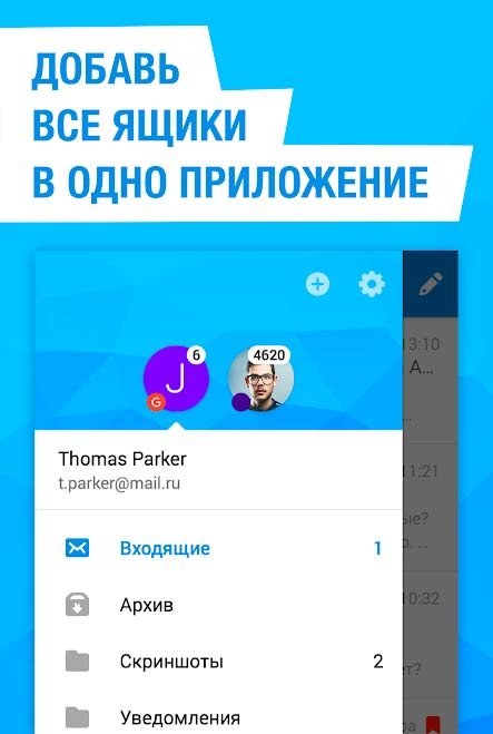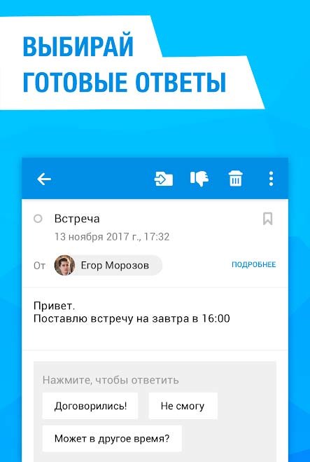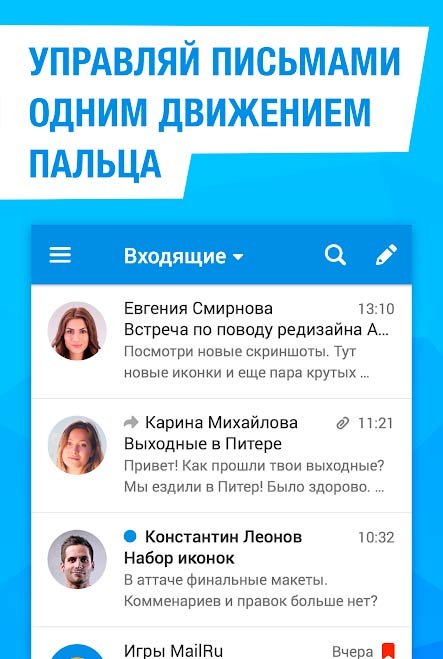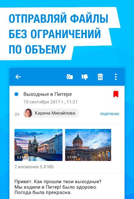 Теперь пользователи смогут с простотой пользоваться своей виртуальной почто, а все это благодаря такому оригинальному и простому в пользовании приложению. Вместе с этой программой пользователи легко смогут использовать одновременно несколько своих почтовых ящиков, даже если они будут из разных систем. Получайте уведомления на свое устройство после присланных на ваш адрес писем и отправляйте в клик ответы. Здесь же пользователи, которые смогут скачать Почта Mail.Ru на андроид получат возможность легко делиться своими материалами и файлами любой сложности. Теперь если вам нужно будет срочно получить почту, вы сможете открыть ее со своего мобильного, и неважно где в этот момент будете находиться. Естественно все это делает пользование почтой очень удобным и простым. Здесь также работает фильтрация сообщения от спама, и все они попадают в отдельную папку. Всегда будьте онлайн и принимайте важные сообщения, а также как можно быстрее отвечайте на них.