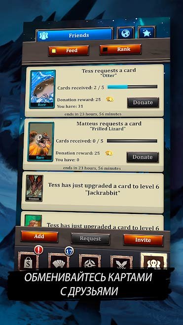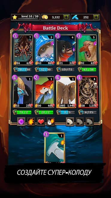 Теперь каждая ваша очередная битва будет захватывающей и динамичной. Собирайте невероятное количество карт боевого назначения и экспериментируйте в битвах. Каждое очередное сражение будет проходить на фоне самого реалистичного пейзажа любой дикой природы. В сочетании с боевой атмосферой это выглядит просто потрясающе и нереально оторвать взгляд. Используйте пошаговую стратегию для интенсивных боев и выигрывайте каждую схватку. Когда сможете скачать Battle Cards Savage Heroes TCG / CCG на андроид, ваши битвы будут проходить только в многопользовательском режиме игры. Встречайтесь с игроками по всему миру и выигрывайте ценные трофеи. Игра будет очень интересной не только для новичков, но и для опытных стратегов карточных битв. Получайте опыт после каждого поединка и тренируйтесь с высокой интенсивностью. Вы сможете развивать способности и навыки своих героев, чтобы произвести впечатления.Battle Cards Savage Heroes TCG / CCG – карточная битва героев