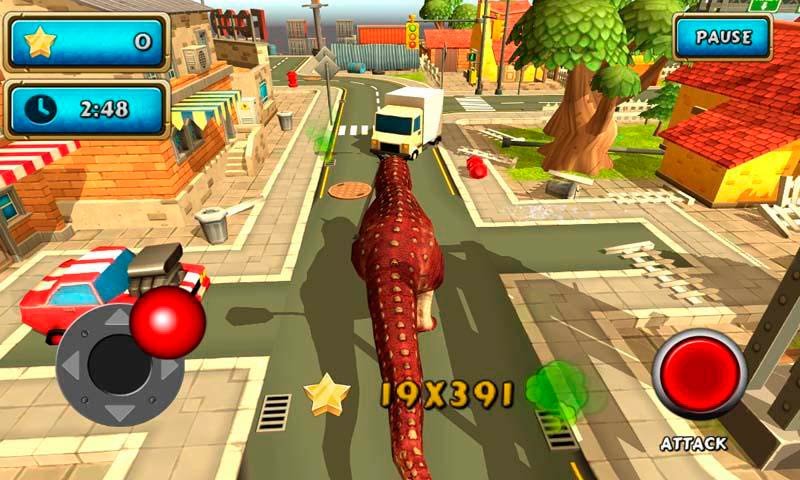 Решившимся скачать Dinosaur Simulator: Dino World на андроид будет предложена уникализированная возможность играть за Динозавра и сносить все объекты на карте города. Общая игровая окружающая среда создана в великолепной трехмерной графике, поэтому все выглядит настолько реалистично. Даже физический движок позволяет почувствовать реалистичность игрового процесса. За участием в таком уникально приключении можно будет провести огромное количество часов подряд и узнать о существовании более чем тридцати видов Динозавров. Узнайте, на что способен Карнотавр, Тираннозавр и остальные монстры этого огромного мира. Шесть уровней сложности должен будет пройти игрок, пока не сможет разнести каждую локацию в хлам, не оставив и следа о присутствии цивилизации.Информация об игре