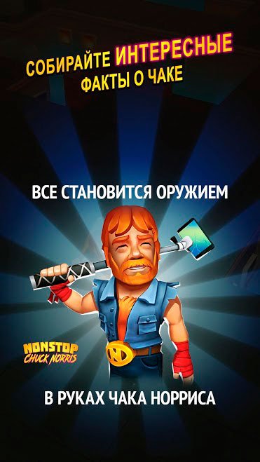 Игроку необходимо будет получить себе невероятные мощные силы, чтобы потом помогать Чаку Норрису в самом неповторимом боевике мобильной истории. Миллионы игроков уже загрузили себе этот невероятно крутой боевик и теперь будут готовы принять участие в нем. Путешествуйте по разнообразным локациям и наслаждайтесь полномасштабными боями. Играть за Чака Норриса сможет каждый, кто попробует скачать Nonstop Chuck Norris на андроид. Улучшайте своего героя постоянно и развивайте его суперспособности. Игроки смогут изучить большое количество разнообразных приемов и ударов, чтобы составить из них комбинацию и продемонстрировать на деле мощь главного героя. Противников будет невероятно много, и с каждым новым уровнем они будут становиться еще сильнее. В задачи Чака Норриса входит спасение всего мира от грозной преступной банды. Каждый день зарабатывайте новые награды и открывайте достижения, способные продвинуть вас дальше по сюжетной линии.Крутые мобильные драки - Nonstop Chuck Norris