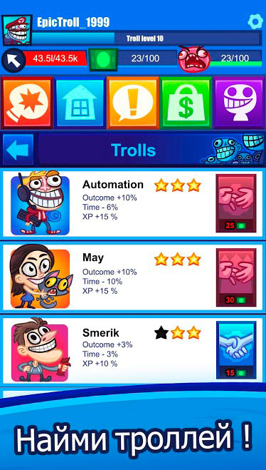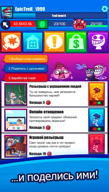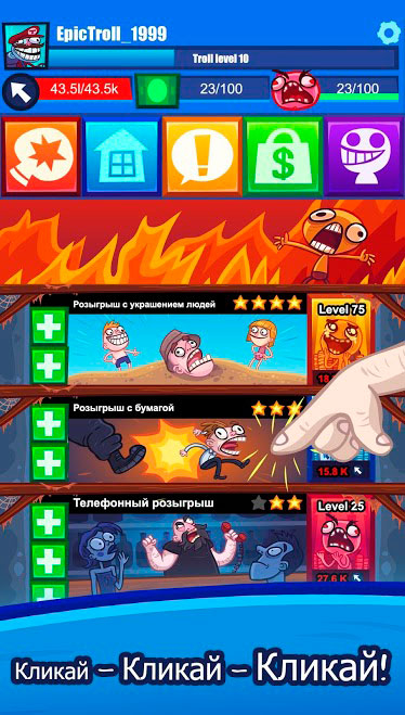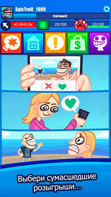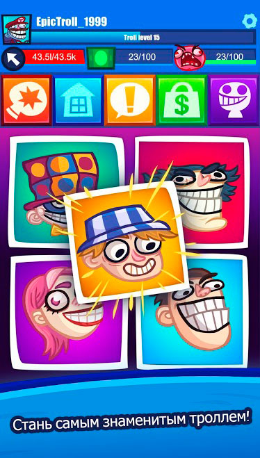 Устройте самый захватывающий троллинг и веселитесь в процессе игры. Главному герою необходимо будет разыграть своих помощников и друзей, чтобы набрать полную коллекцию смешных кликов. Игроки решившие скачать Troll Face Clicker Quest на андроид смогут даже подключиться к социальным сетям, чтобы разыгрывать своих друзей. Станьте самым непобедимым троллером в мире и устраивайте по-настоящему безумными богатеями. Вам понравится эта качественная картинка изображения, выводимая на экран и большое разнообразие розыгрышей. Поднимайтесь на новые уровни каждый день и заполучите новые награды и достижения. Почувствуйте все сумасшествие этой игры прямо сейчас.Информация об игре