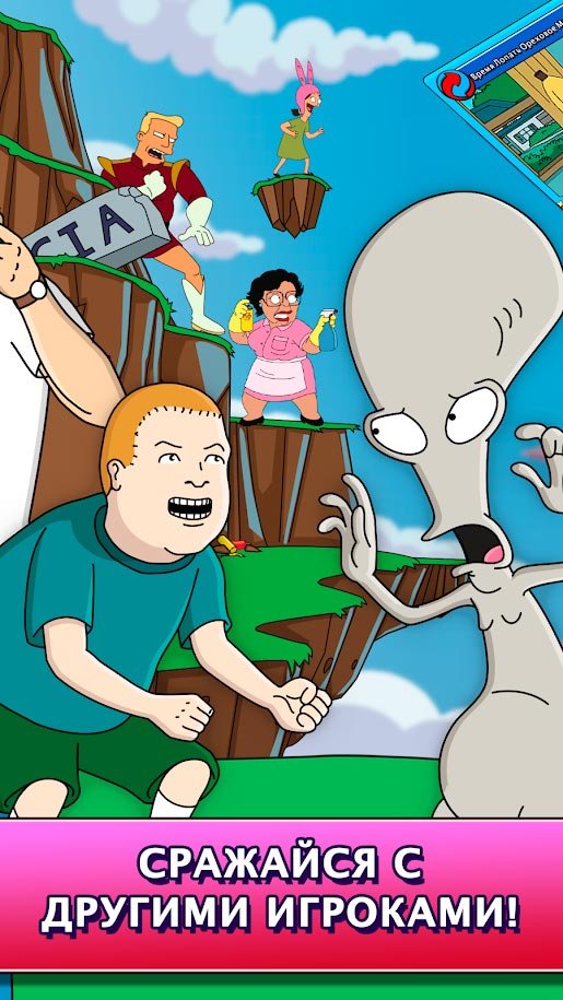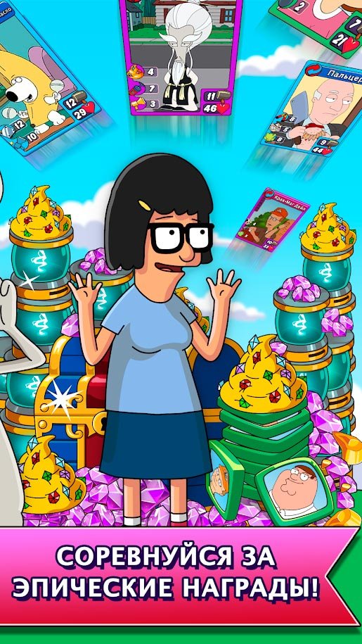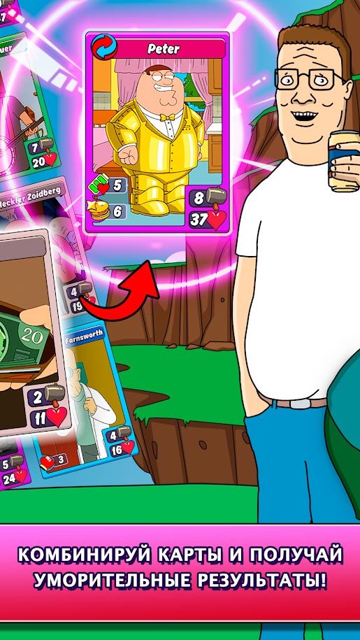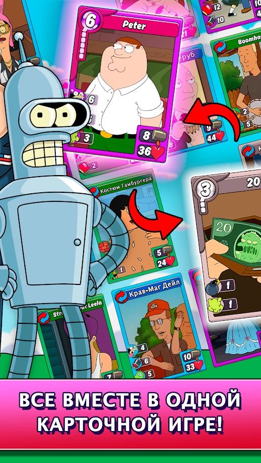 Тебя ждет встреча с Бендером, Роджером и Стьюи. Они все пришли сюда чтобы навести шороху. Еще никогда все они не собирались в одном месте. Проходи компанию, которая состоит сразу из 25-ти увлекательных глав. От игрового процесса будет невозможно оторваться и ты вряд ли перестанешь проходить задания. Встречайся на арене многопользовательского режима с другими игроками со всего мира. приглашай друзей против которых можно будет потренировать колоду и получить гораздо больше активного опыта. Постарайся улучшить каждую карточку, делая персонажа мультфильма еще сильнее.