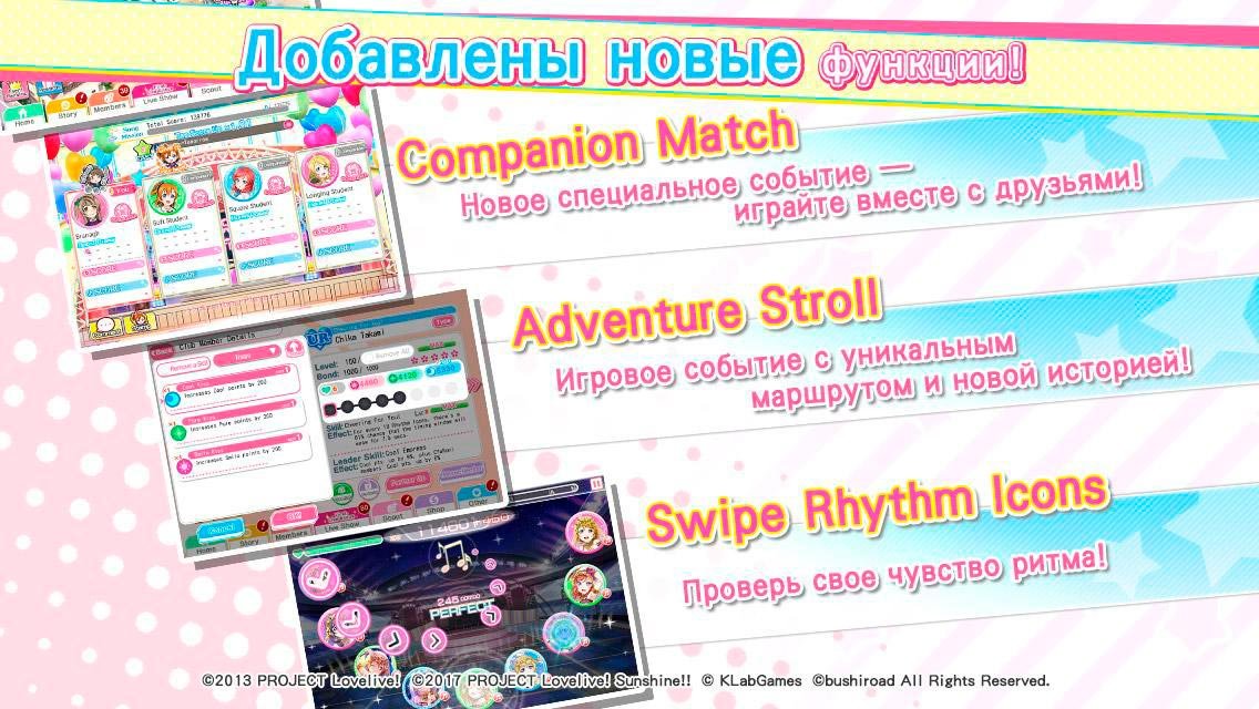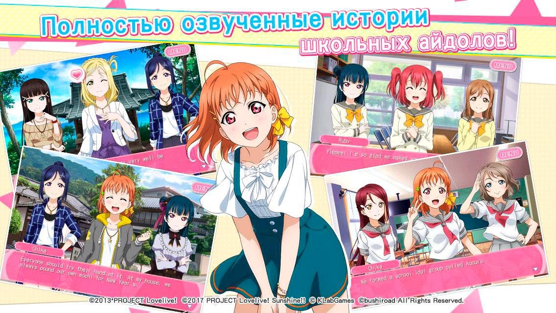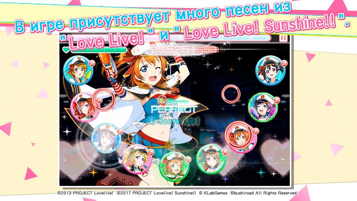 Встречайте в этих потрясающих приключениях множество лучших в мире героев. Знакомьтесь с ними и наслаждайтесь увлекательным геймплеем. Оказывайте масштабное влияние на настоящих звезд из школы и помогайте им выполнять абсолютно любые задачи. Только игроки из LoveLive! School idol festival смогут помочь им осуществить все свои заветные мечты и воплотить их в реальность. Управление эти игровым процессом в стиле японского аниме осуществляется очень легко и просто, так что даже новички в таком игровом жанре смогут быстро освоиться. Вам нужно постараться помочь абсолютно всем школьным звездам и будет это просто замечательно. Встречайте первый японский экшен, разработанный на русском языке LoveLive! School idol festival и наслаждайтесь прохождением огромного количества уровней. Больше всего в восторге от этой игры будут, конечно же, девочки. Займитесь управлением музыкальной группы и в одно касание исполняйте потрясающие музыкальные композиции.LoveLive! School idol festival – японский хит на русском
