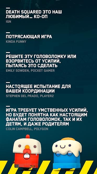 Действительно потрясающая игра, собравшая в себя уникальные элементы геймплея и захватывающие принципы действий. От игроков здесь потребуется очень много усилий умственного плана. Вместе с Death Squared легко можно стать поклонником жанра головоломок и фанатом их геймплея. Такой увлекательный игровой процесс идеально подойдет как детям, так и взрослым. Решайте эту потрясающую головоломку и прилагайте максимум усилий, пока не доберетесь до лучшего места в рейтинге. Вас ждут самые сложные испытания и ловушки, требующие координации и силы реакции. Сыграйте вместе с другом в этом увлекательном приключении и наслаждайтесь.Информация об игре