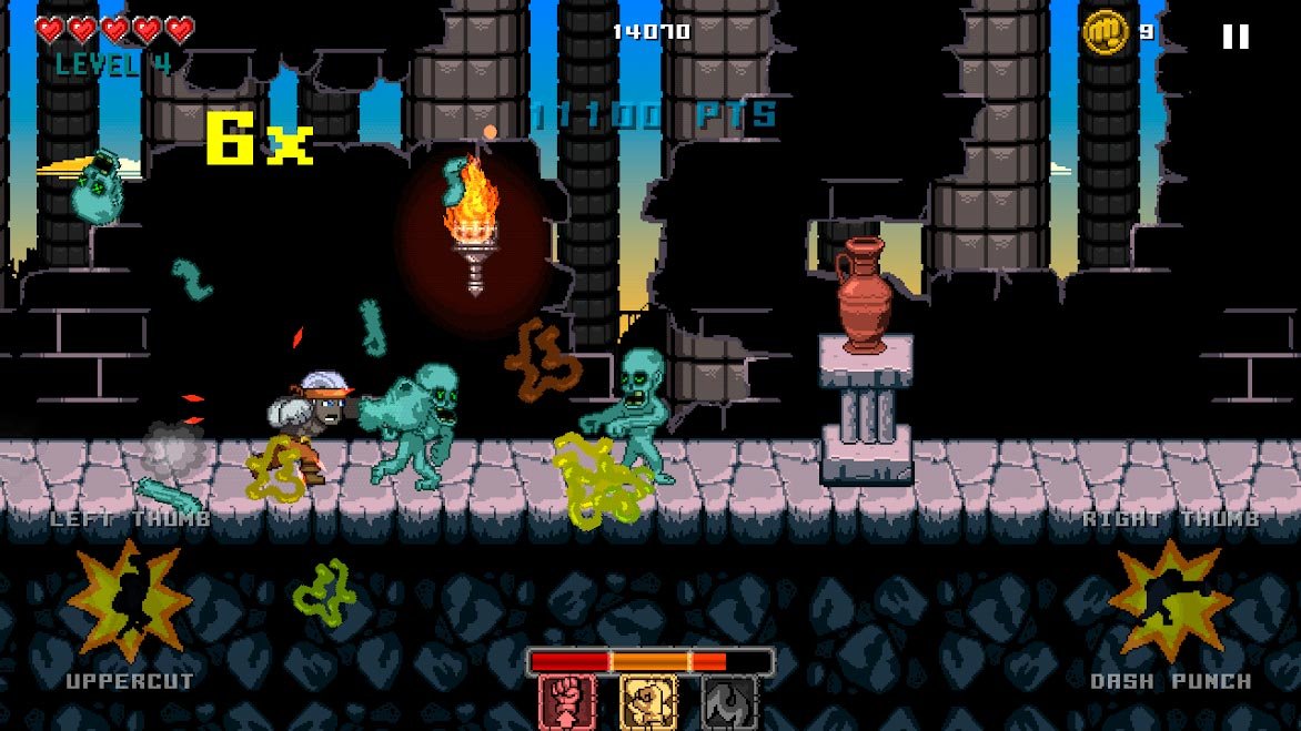 Приготовьтесь испытать и проверить себя в самом крутом файтинге мира пиксельной графики. Примите на себя роль главного героя настоящего уличного воина и выходите в разные локации, где вас будут ждать новые битвы. Используйте простое управление сенсорными кнопками, чтобы контролировать удары своего главного героя из мира Punch Quest. Простыми касаниями правым и левым пальцем вы сможете пройти все эту игру, но только если наберете достаточно опыта и навыков. Используйте простые удары левой, правой или апперкотом, а также изучите дополнительные специальные приемы, которые смогут отобрать у врагов огромное количество жизней. Путешествуйте в Punch Quest через мрачные и темные подземелья и там находите новых врагов. В каждом кусочке этого масштабного мира будет огромное количество монстров и их нужно постараться выиграть. Участвуйте в дополнительных квестах, и за них выигрывайте легендарные предметы.Punch Quest – пиксельная графика и замечательный файтинг