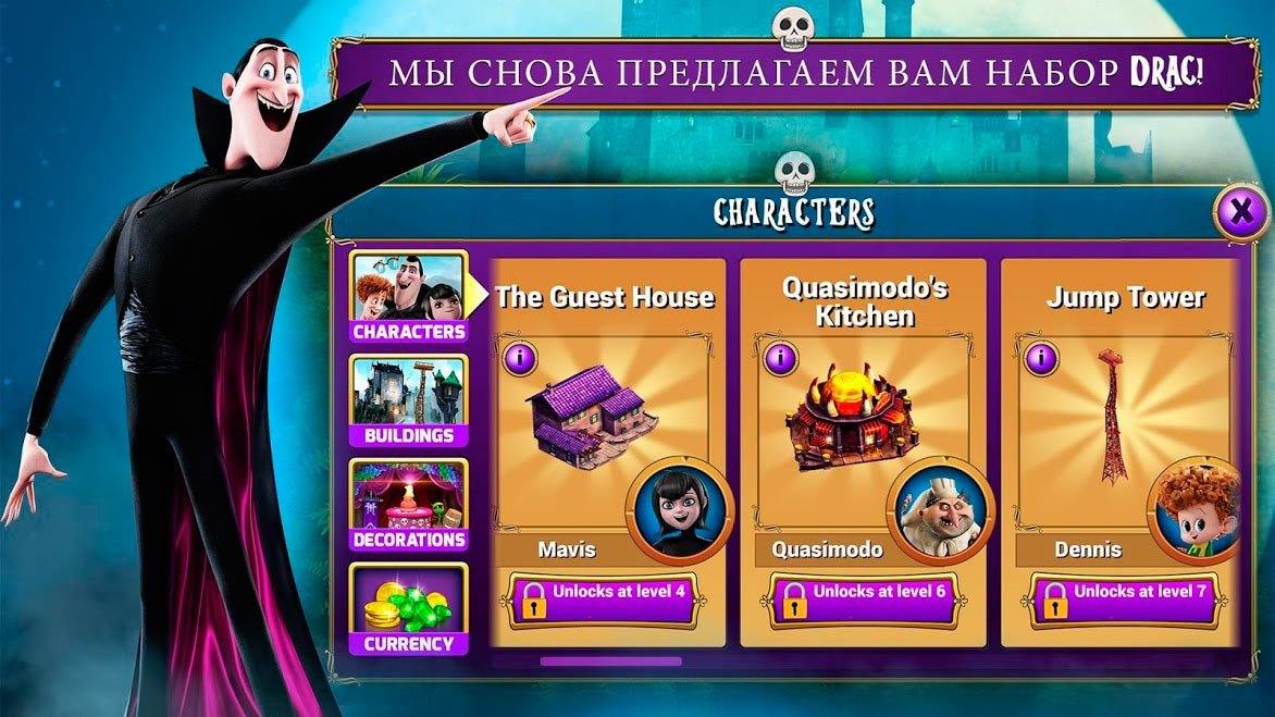 Приступайте сразу к строительству своего собственного отеля вместе с главным героем Дракулой. Собирайте в комнатах своего огромного отеля как можно больше монстров и выделяйте каждому номер. Кроме участия в жизни гостиницы игрок сможет создавать город в соответствии со своей удивительной фантазией. Параллельно участники Hotel Transylvania 2 могут проходить захватывающие квесты и получать за них награду. Постарайтесь сделать свой отель намного красивее и приятней для проживания здесь чудовищ. Играйте вместе с ними в очень интересные мини-игры. Этот игровой процесс является официальным от создателей мультфильма. Сыграйте вместе с такими персонажами как Граф Дракула, Мумия, Франкенштейн, Зомби и многие другие тоже заселяться в Hotel Transylvania 2. Здесь действительно огромное количество разнообразных монстров, за которых можно будет играть в специальных мини-играх. Знакомьтесь с новыми героями каждый день и просто наслаждайтесь потрясающим геймплеем.
