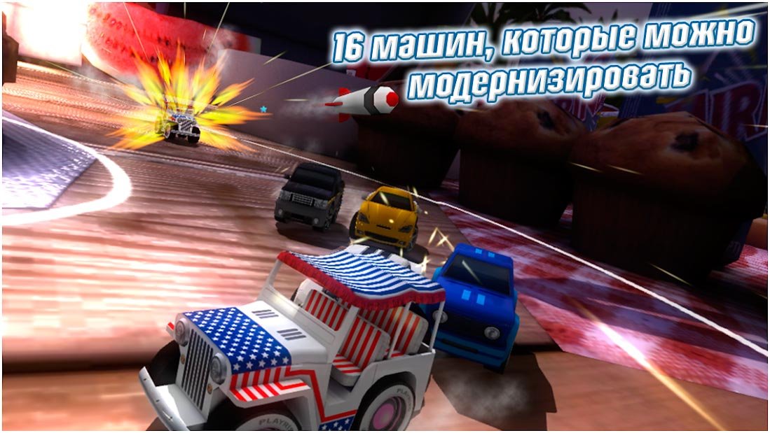 Сразу в глаза бросается эта потрясающая трехмерная графика, которую запросто можно сравнить с приставками. От самого геймплея захватывает дух, но им удобно пользоваться. За игрой в Table Top Racing бесплатно можно провести невероятное количество часов подряд и даже попробовать вызвать своих друзей на гонку. Покажите им, чего вам удалось добиться здесь, и выиграйте награду в качестве приза за первое место. В этой огромной игре собралось очень много разнообразных тачек, отличающихся по своим индивидуальным характеристикам и способностям. Можно выбрать любую из них и сесть за руль, чтобы сражаться с игроками по всему миру. Заставьте своих соперников дрожать при виде вашей крутой тачки. В Table Top Racing бесплатно можно заниматься улучшениями своих машин и даже превращать их в спортивные каты. Все что будет находиться на этих необыкновенных трассах, можно использовать, включая даже мощные стволы. Попробуйте выиграть каждую битву и станьте лучшим в истории.Table Top Racing бесплатно – самые популярные из безумных гонок