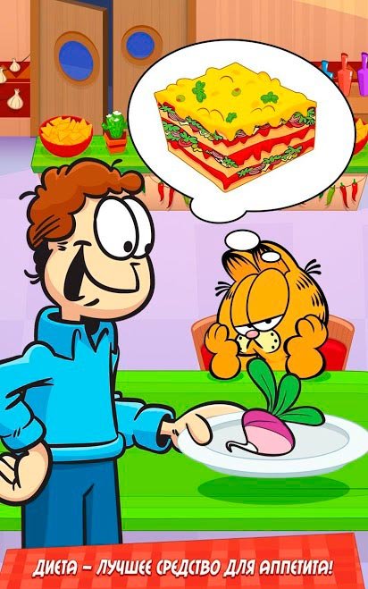 Гарфилд постоянно чувствует себя голодным и поэтому он готов съесть тонны гамбургеров и лазанью. Единственная беда заключается в Джоне, который всегда решителен в своих действиях и попытается посадить на диету кота снова. Он смотрит за ним каждый день и следит за его рационом питания. Приняв участие в Гарфилд: Моя СЫТНАЯ диета вы должны будете помогать Гарфилду каждый день питаться так, как он захочет и делать это правильно. Могли ли вы представить, что в одной игре вместе с котом Гарфилдом вы сможете познакомиться даже с Мошенником Томом. Два этих самых хитрых персонажа вселенной будут воровать закуски прямо со стола и посетят для этого огромное количество стран. Используйте свои коварные планы и замыслы для того, чтобы обмануть всех и украсть как можно больше вкусной еды. Все это в Гарфилд: Моя СЫТНАЯ диета будет очень весело и главное интересно. От такого безумного веселья сложно оторваться, и хочется его еще больше.Кот и Мошенник Том готовы воровать в Гарфилд: Моя СЫТНАЯ диета