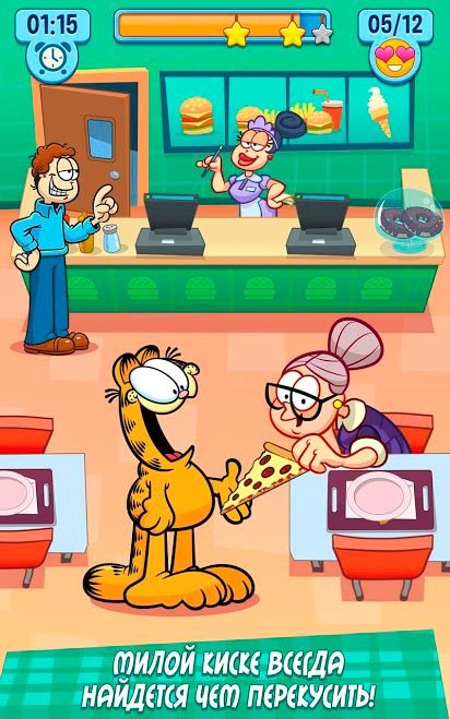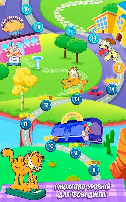 Вы можете пройти больше сотни увлекательных и забавных уровней, где вам предстоит работать с фастфудами. Попробуйте сыграть в роли Гарфилда и откройте огромное количество костюмов, которые потом сможет примерить ваш кот. Наслаждайтесь красотой и затягивающим процессом этой аркады. Вопреки ожиданию Джона в Гарфилд: Моя СЫТНАЯ диета вам нужно будет превратиться в самого толстого в истории кота. Пользуйтесь разными усилителями и бонусами, чтобы добиться лучших результатов. Очень смешно выглядит анимация и графика этого игрового процесса. Пройдите целую линию заданий этой сюжетной линии своего виртуального мультика.Информация об игре