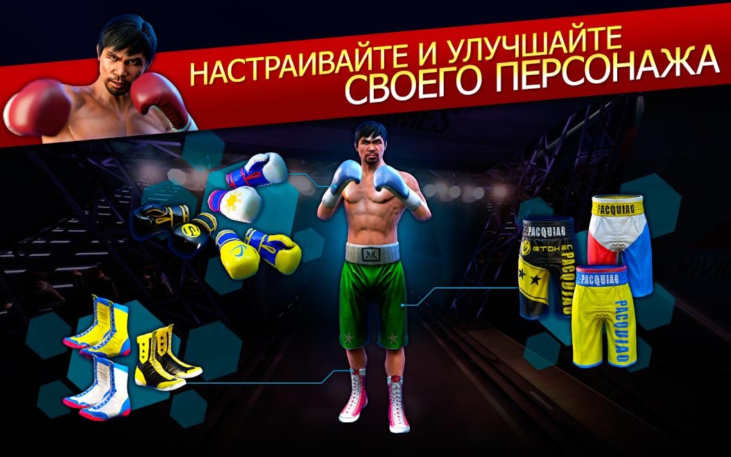 Пришло время узнать, какой из вас боксер вышел, и пройти на ринг. Сыграйте в крутых турнирах, которые успел пройти Чемпион Мира Мэнни Пакьяо, и играйте даже в его роли. Продемонстрируйте все свои способности в деле и наслаждайтесь реализмом процесса. Каждый день, неделю вас будут ждать турниры и чемпионаты, участвуя в которых можно стать лучшим бойцом. В Real Boxing Manny Pacquiao игроки получают возможность пройти карьерный путь Мэнни и узнать, как он дошел до такой награды. Кроме самого Чемпиона здесь есть и другие бойцы, и сыграть можно будет за абсолютно любого. Постарайтесь выиграть самый главный приз и наслаждайтесь всей реалистичностью атмосферы. Используйте снаряжение, боксерские перчатки и перед каждым своим следующим боем участвуйте в тренировочном процессе. Так в Real Boxing Manny Pacquiao можно будет улучшить свои боевые показатели и способности, чтобы добиться еще больших достижений и наград.