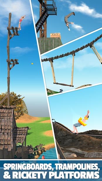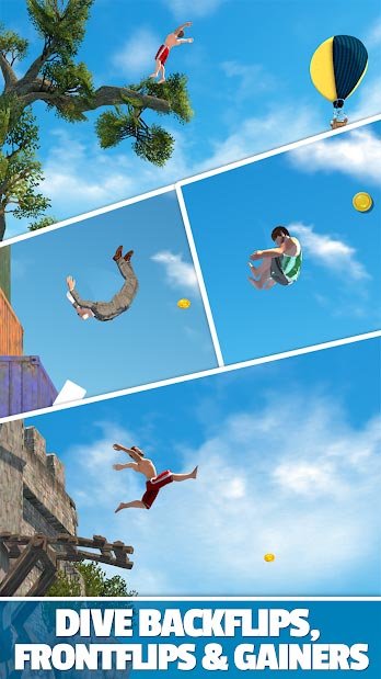 Приготовьтесь испытать напряжение от такой увлекательной и интересной игры с реалистичным физическим движком. Здесь подобрано большое количество разных локаций, где есть вещи для осуществления своего первого прыжка. К примеру, в Flip Diving игроки могут пользоваться для прыжков деревьями, батутами или еще множеством других предметов. Кроме того вам не придется постоянно играть за одного персонажа и в процессе достижения успеха есть вариант открывать новеньких водолазов, а каждый из них обладает своими персональными наборами навыков и способностей. Открывайте возможности исполнять еще более крутые трюки и приемы в ходе своих прыжков. Главная задача для играющих в Flip Diving не разбиться о камень или дно. Разработчики использовали здесь сбалансированный физический движок, который позволяет управлять персонажем как куклой. Поэтому дайвинг выглядит таким реалистичным и с особенной динамикой движений.