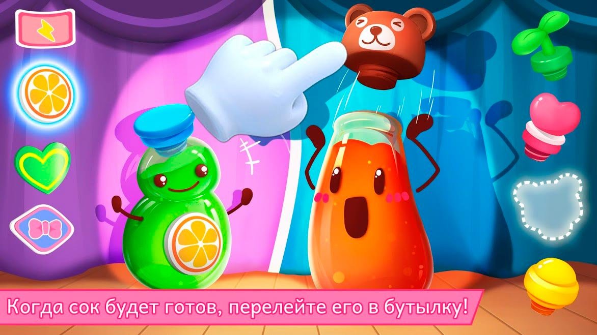 Красивая трехмерная графика изображения в стиле детского мультика. В ней будет очень приятно играть, и наслаждаться такой атмосферой. Попробуйте смешать сразу три одинаковых вкуса, чтобы получился вкуснейший охлажденный микс. И дети, и взрослые могут попробовать Фреш-бар Малыша Панды и развиваться. Закупайтесь самым современным оборудованием и инструментами, чтобы готовить, выжимать, разливать и смешивать. Переливайте готовый микс в бутылочки, которые потом обязательно купят ваши посетители. Пусть все персонажи собираются вместе, пробуя эти соки.