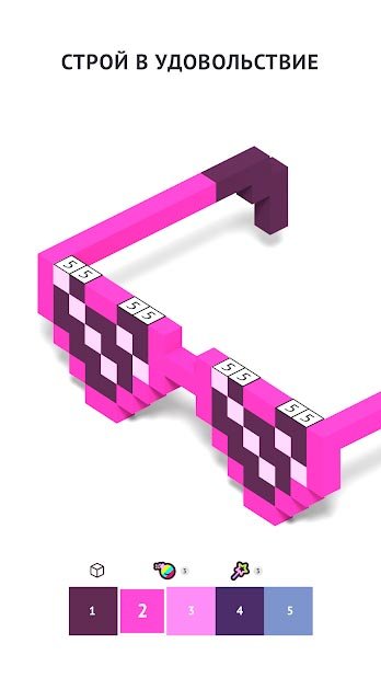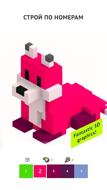 Все мы в детстве любили раскрашивать, но каждый любил определенную тематику. Кому-то нравилось раскрашивать животных, а кто-то любил насыщать красками машины. Теперь неважно, какая тематика ближе всего к вам, потому что в Pixel Builder можно будет раскрашивать все что угодно. Зачем красить на бумаге, когда есть виртуальные игровые приложения. более того, уже и пиксельные раскраски не в тренде, а вот трехмерные самое то и каждый желает попробовать сыграть в такую. Откройте совершенной новый формат графики, где из пикселей вы сможете составлять полноценные трехмерные рисунки. Сотни разнообразных трехмерных рисунков будет доступно здесь, и каждый вы сможете наполнить насыщенными красками и цветами. Открывайте благодаря Pixel Builder в себе новые таланты. Идите пошаговой тактики и составляйте новые шедевры, а также в деле выбирайте свои определенные стратегии. Пиксели могут быть абсолютно любой расцветки.Pixel Builder – трехмерная раскраска кучи объектов