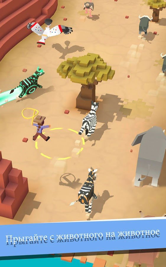 Когда решишь скачать Дикое родео: Зоопарк на андроид поймешь, как же это здорово гонять на бешеных быках, разъяренных слонах и на других не менее опасных зверюг. Все они относятся к редким видам, а в саванне таких полно. Будь осторожен, потому что на дороге полно преград, которые нужно обходить. В противном случае ты слетишь с животного, а он, возможно, раздавит тебя. Игрок сможет побывать не только в сказочной саванне, но и попытается оседлать зверей в джунглях, которые еще опаснее и страшнее. Приручи любых зверюг и посмотри на них в своей огромной коллекции. Возможно, из них можно будет открыть целый зоопарк. Тебя ждет приключения о которых можно только мечтать. Воплоти в жизнь самые смелые задумки и получи дозу адреналина. Улучшай свои навыки родео и получай опыт, который обязательно пригодится.