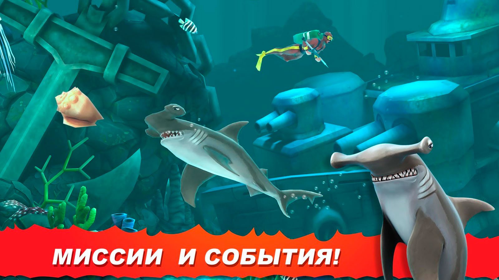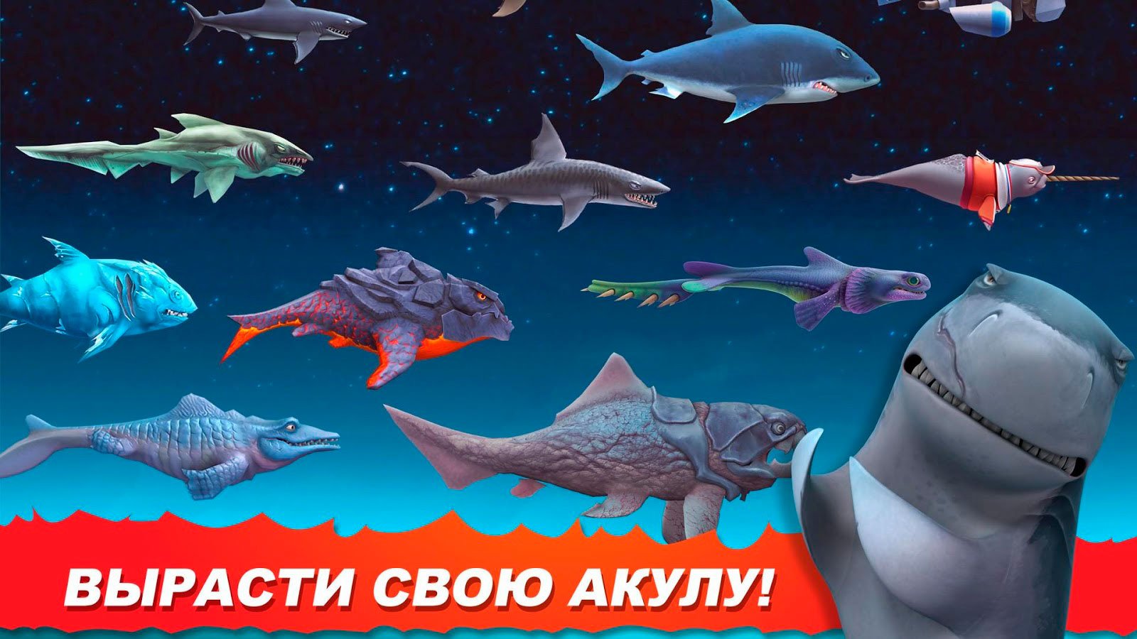 К одному из преимуществ игры можно отнести широкий выбор хищников, за которых можно будет сыграть в этом опасном водном приключении. Попробуйте прочувствовать ощущения Большой Белой акулы, сыграйте за уникальную рыбу-молот, выбирайте Магалодон и проходите все этапы эволюции этих морских обитателей. Всего игрок, который сможет скачать Hungry Shark Evolution на андроид, получит доступ к десятке самых поразительных форм и видов. Кроме акул здесь полно других существ, которые не против поохотиться.