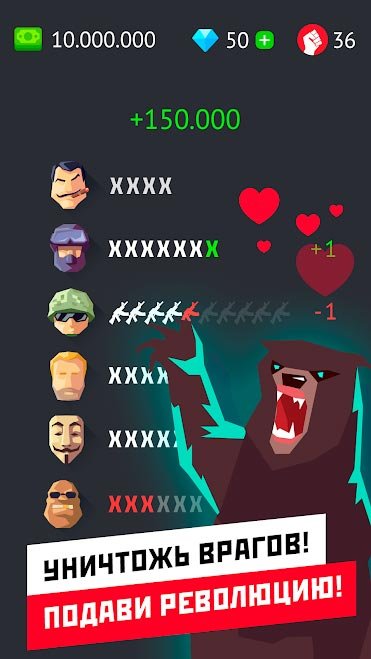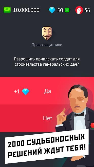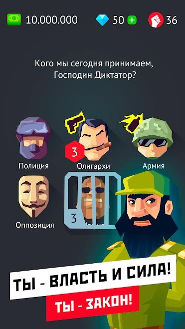 Игроку предстоит выполнить очень важную миссии, чтобы удержать власть в своих руках и не позволить совершить переворот. Постоянно думайте над новыми решениями и каждым своим шагом. Вам нужно будет легко разбираться со своими врагами в Диктатор – Управляй миром! И находить как можно больше друзей для себя. Вместе вы сможете узнавать много тайной информации и быстро пресекать любую возможность заговора против вас. Всегда думайте и переживайте за свою команду и помогайте ей обрести счастье в демократической республике. Игрокам Диктатор – Управляй миром! Предстоит выполнить великолепное количество заданий, чтобы пройти как можно дальше и выполнить кучи миссий. Попробуйте разобраться с подкупными прокурорами и не забывайте про проблемы со стороны бизнесменов. Иногда вы будете действовать против законов и правил, но этого потребует ситуация.Диктатор – Управляй миром! И наслаждайтесь властью