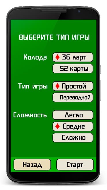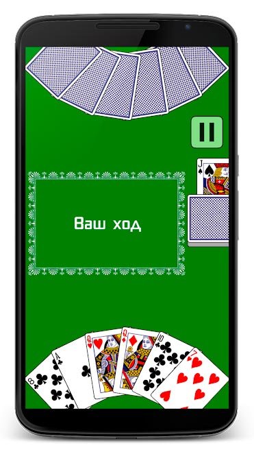 Дурак – это классическая карточная игра в формате удобного приложения на ваш мобильный гаджет. Правила здесь абсолютно такие же, как и в обычных картах – избавиться от всех карт на руке не последним в раунде. Все те же привычные козыри и остальные масти будут в обороте. Играйте с различными противниками и развивайте свой навык с каждой новой партией. Простое и удобное управление делает игровой процесс еще приятнее, а качественная картинка и атмосферная музыка оставляют лишь теплые воспоминания.