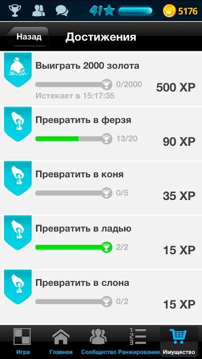 Играйте в любом з трех доступных режимов, среди которых есть стандартный классический, блиц режим и даже скоростной режим, в котором могут соревноваться только самые лучшие игроки современности. Устанавливайте новые рекорды каждый день и продвигайтесь как можно дальше. Вы можете каждый день улучшать свою статистику в Шахматы онлайн, и вас выберут самым лучшим. Гонки и конкуренция в рейтинге заставит игроков повысить свое мастерство и выиграть кучу достижений. Если играть в одиночном режиме без интернета, тогда есть шанс пройти больше двадцати уровней сложности и взлететь на вершину рейтинга.