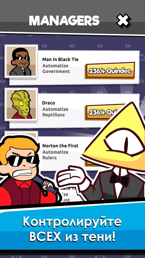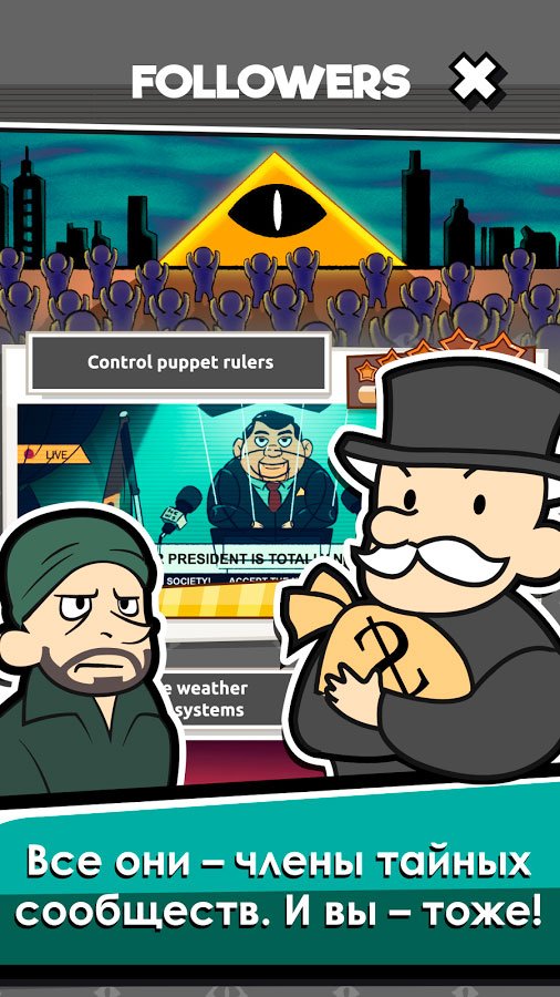 Игрок должен попробовать скачать We Are Illuminati – симулятор тайной организации на андроид и узнать про абсолютно новые возможности. Научитесь оказывать влияние на другие структуры и подчиняйте их к своей власти. Вы должны научиться контролировать каждого участника сообщества и простых мирных жителей. Никто не должен скрыть от вас правду или что-нибудь необычное. Научитесь контролировать свое мышление, участвуйте в секретных разработках, ведите переговоры с инопланетными существами и еще много чего другого можно будет сделать в этом игровом процессе.