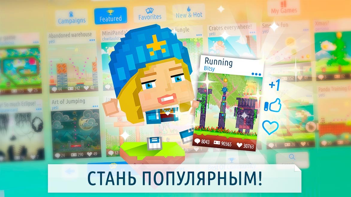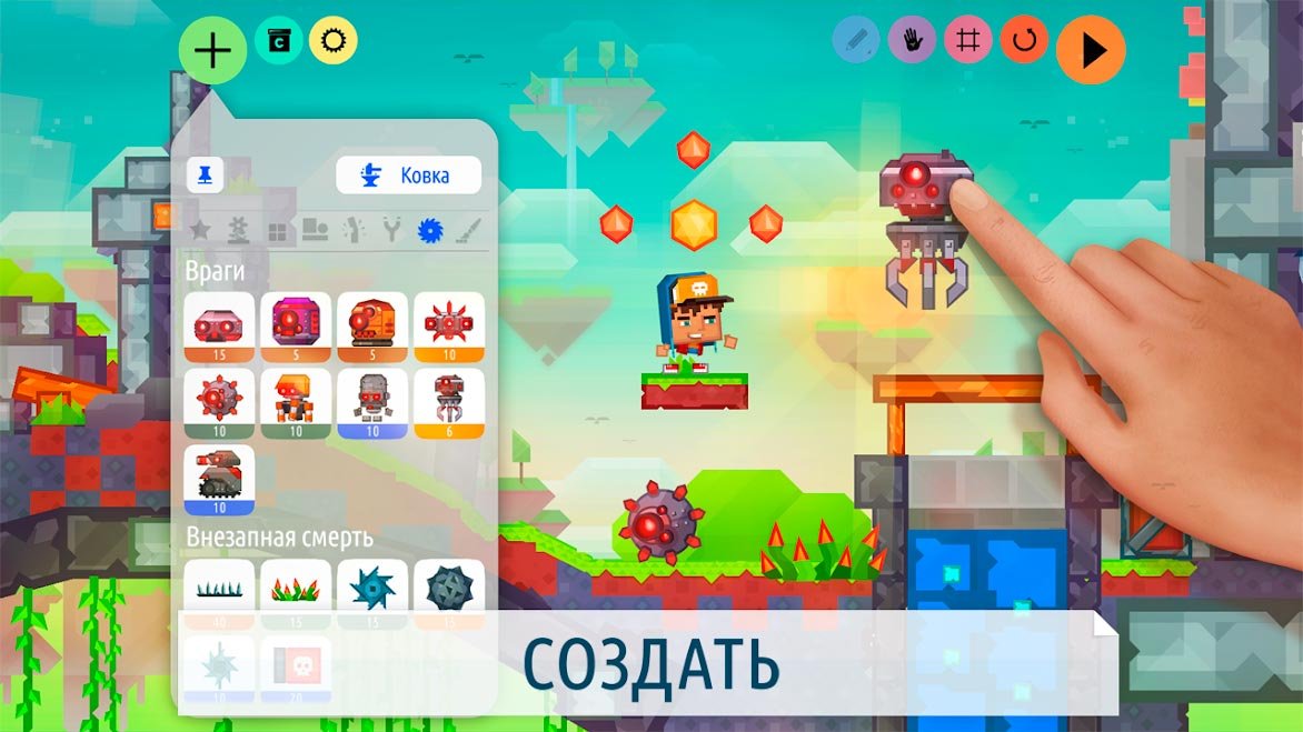 Когда вы раньше хотели сыграть в самый интересный платформер, то часами исследовали просторы интернета чтобы найти то, что вам действительно понравится. Теперь у вас может оказаться Createrria 2 craft your games! И в ней каждый самостоятельно может нарисовать новые уровни, после чего попробует их пройти. Вам нужны только творческие таланты и палец, чтобы создать свой самый первый уровень. Нарисуйте трассу, а после этого расставляйте множество объектов и предметов. Кроме того, игроку придется поставить и врагов. Быть может получиться сделать самый сложный в истории уровень, а потом его можно будет дать попробовать своим друзьям. Пусть у вас будет своя собственная игра, в которой только вы считаетесь хозяином виртуального мира. Используйте множество разных материалов, чтобы возвести объекты или оружие. На полную мощь включайте фантазию, чтобы пройти множество уровней и стать легендарным героем. Герои из Createrria 2 craft your games! Считаются себя самыми креативными.