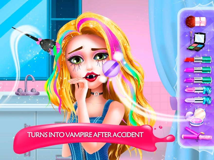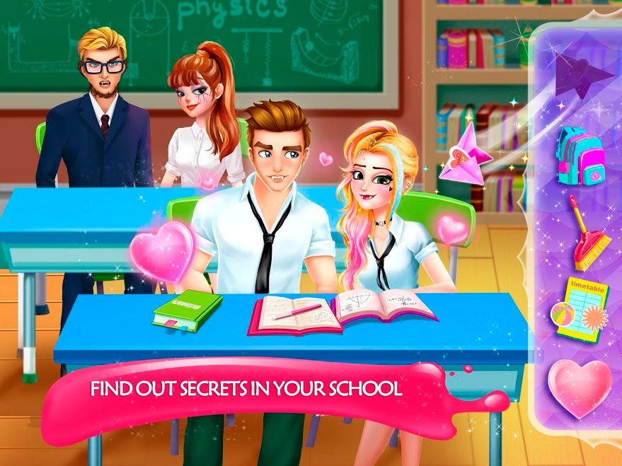 Как только вы начнете свою уникальную сюжетную историю, сразу же нужно заняться внешним видом главной героине. Нанесите для этого красивый макияж, создайте прическу и естественно выбирайте наряды. Всех этих элементов и предметов в игре будет доступно невероятно огромное количество. Постарайся создать самый шикарный и неповторимый внешний вид героини. В Секретная средняя школа Сезон 1: Любовь вампиров использована самая интересная сюжетная линия, проходя которую будет очень сложно оторваться от игрового процесса. Занимайтесь совершенствованием внешнего вида своей героини и сделайте его уникальным. Все это понравится девочкам обязательно, особенно благодаря вампирам и романтических сценариев.