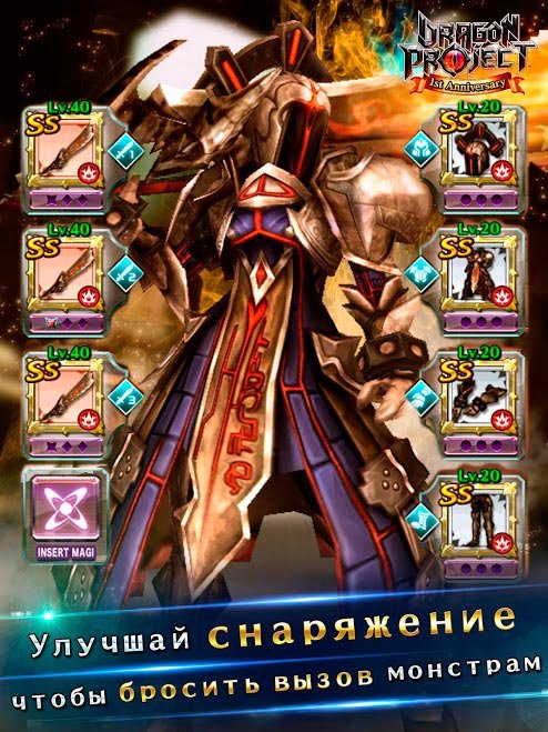Путешествуйте по фантастическому миру и начните охотиться на могущественных монстров. Все они могут стать вашей добычей или союзником. Создавайте крутое вооружение и вместе с ним пройдите этот опасный и трудный путь. Постарайтесь перебить всех монстров, а каждую неделю вас жду встречи с новыми, которых добавят разработчики. В Dragon Project полно инвентаря, которым игроки могут воспользоваться. Тренируйте своего героя и прокачайте его навыки до максимального уровня. Играя через режим реального времени у вас появятся друзья, вместе с которыми участвовать в приключениях будет еще интереснее.Информация об игре