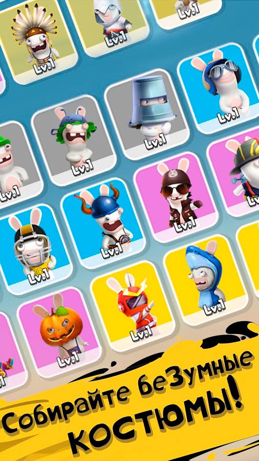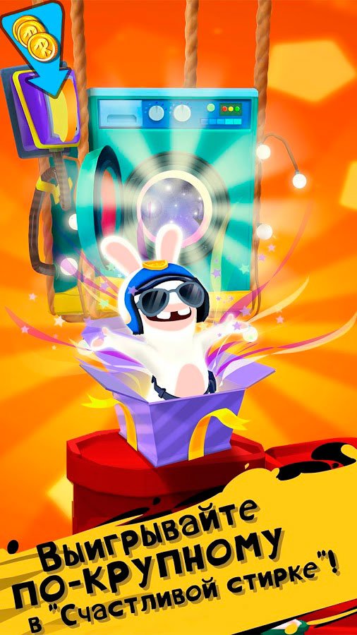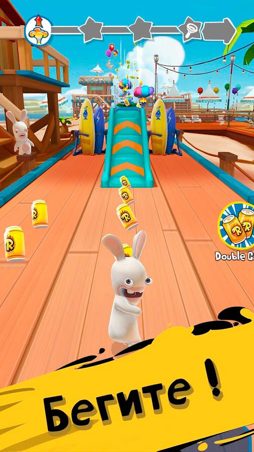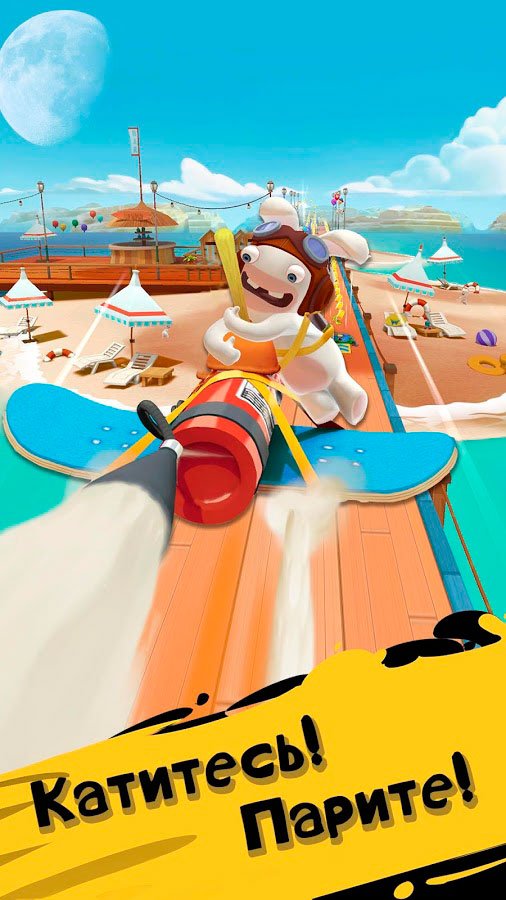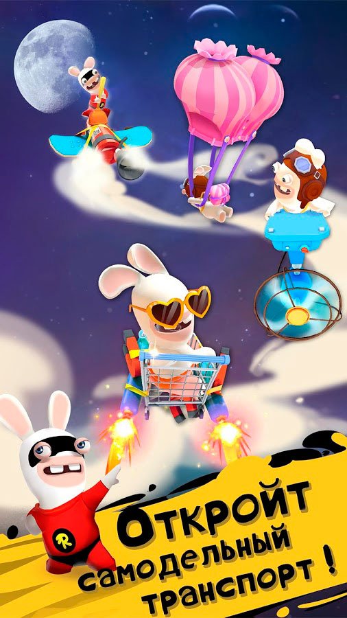 На самом деле он будет очень странным и даже глупым. Кролик придумал уникальный план, по которому он должен будет улететь на луну на своем специально созданном шаре. Только теперь осталось наполнить его специальным газом и взлететь далеко в космос. Вы можете скачать Rabbids Crazy Rush на андроид и помочь ему достичь этой цели. Для этого будут хороши все методы. Бегайте с сумасшедшей кроличьей скоростью, перепрыгивайте через препятствия, летайте на самолетиках и катайтесь на машинах. Больше десяти разнообразных транспортных средств будет доступно игроку для прохождения десятка мисси. Покупайте для кролика костюмы, которые повысят эффективность и его скорость.Кролик и его веселые приключения