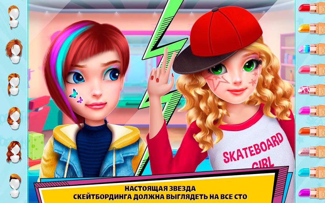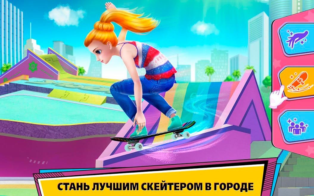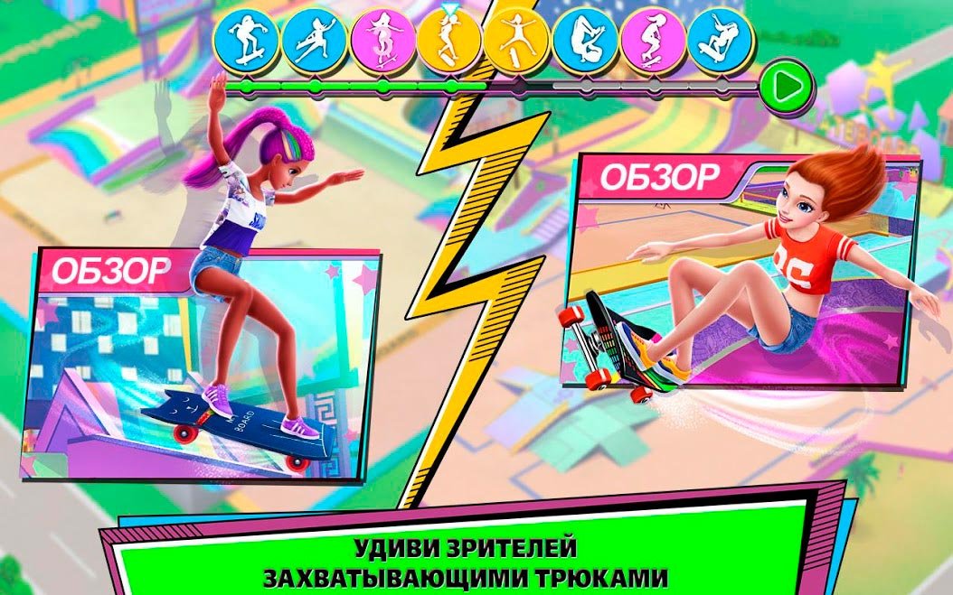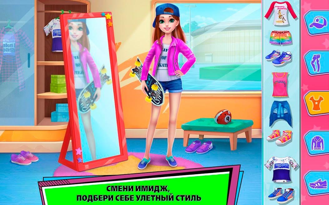 Пришло время обрести популярность и стать самой известной девочкой. Для этого тебе придется бросить все свои силы на спортивные соревнования по скейтбордингу. Выбирай свою первую доску в Девушка-скейтер –Стань королевой скейт-парка! И начинай тренироваться. Каждый день улучшай мастерство и увеличивай уровень, чтобы стать действительно лучшей девушкой, которая смогла овладеть скейтом. Тебя ждут самые захватывающие сценарии, оставляющие огромное количество впечатлений. Скейтбординг очень популярный вид экстремального спорта и поэтому он такой опасный. Чтобы стать настоящей профессионалкой придется очень сильно стараться каждый день и улучшать свой уровень. Потом можно будет забрать все главные награды соревнований и обрести популярность. В Девушка-скейтер –Стань королевой скейт-парка! Кроме самих соревнований есть уникальная сюжетная линия, в процессе которой героиня должна будет пережить романтику и опасности. Обратись к опытному тренеру и впитывай все его уроки, чтобы стать одной из лучших учениц, а потом и чемпионкой.Девушка-скейтер –Стань королевой скейт-парка! С оригинальным сюжетом